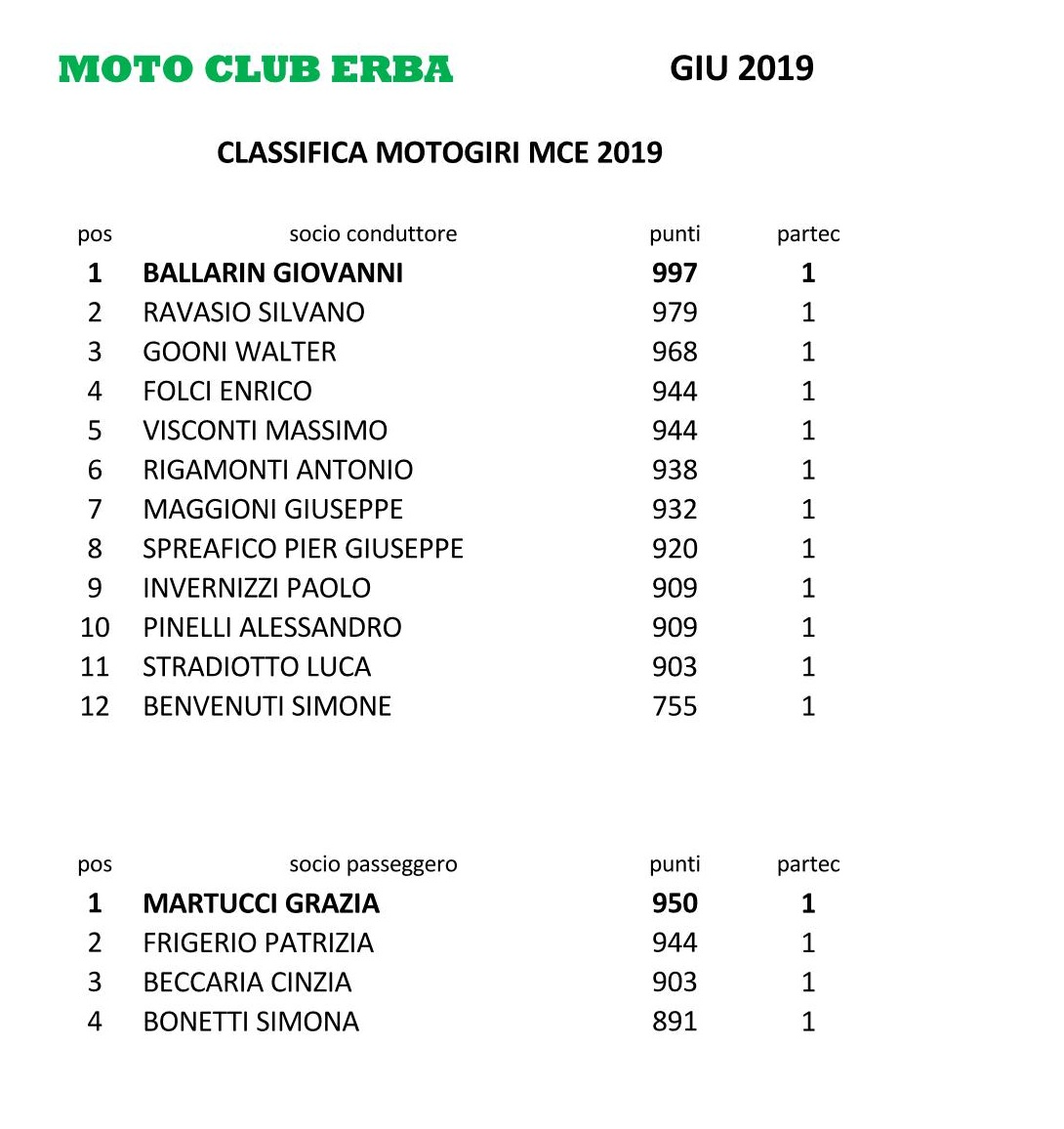 CLASSIFICHE II TRIMESTRE 2019