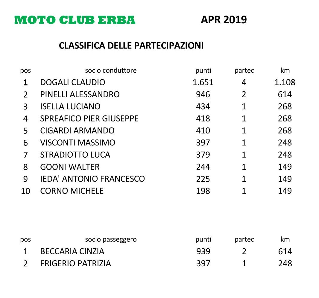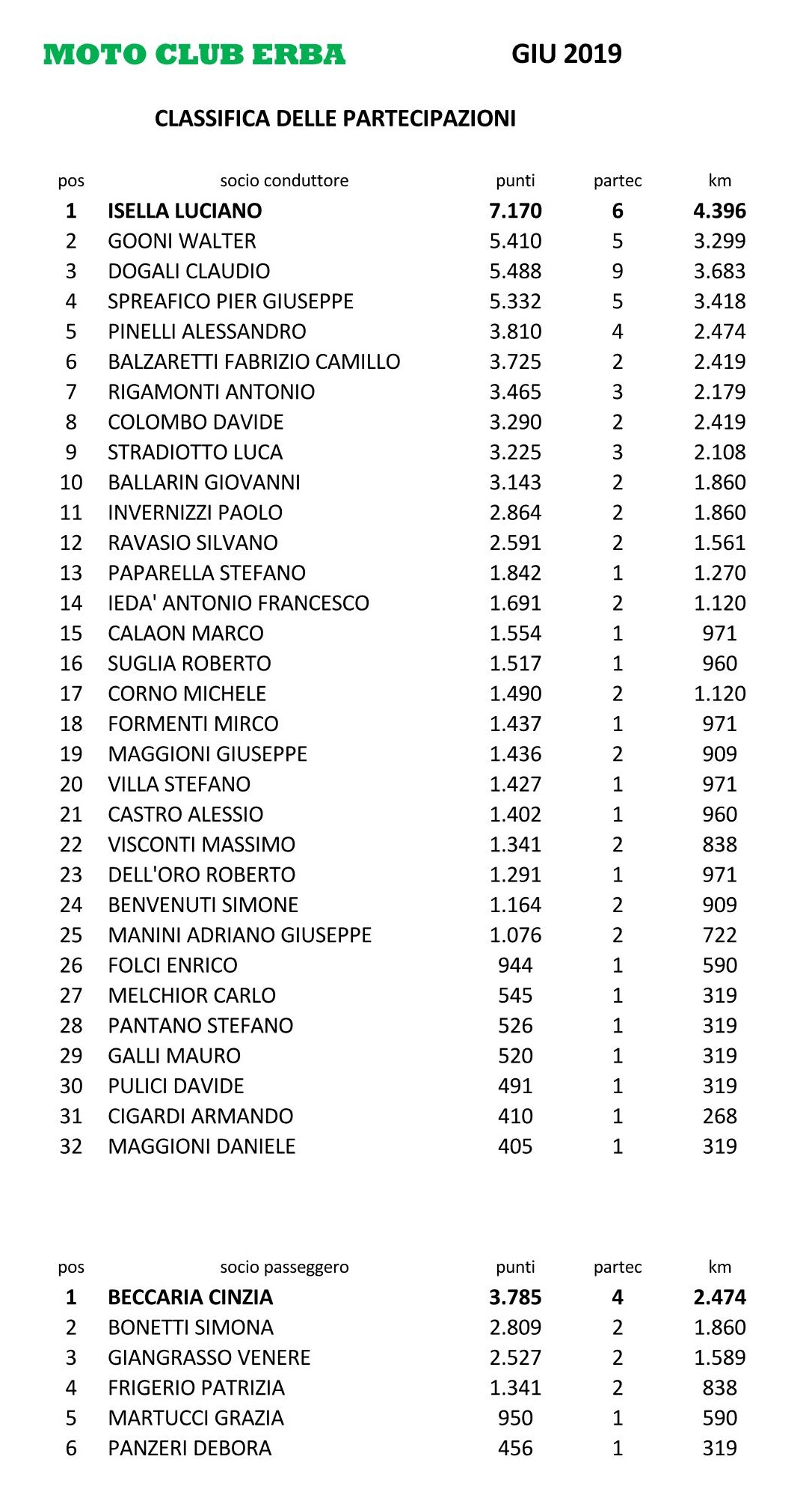 CLASSIFICHE II TRIMESTRE 2019