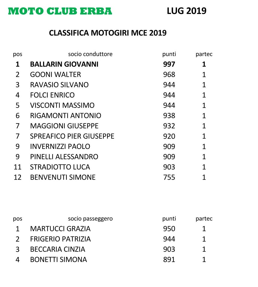 CLASSIFICA DEI MOTOGIRI MCE 2019